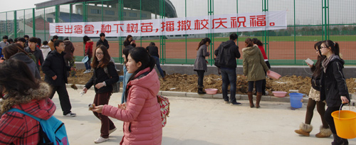 3月12日,我校青年志愿者联合会在仙林校区新运动场外开展了主题为“志愿植树迎校庆我为自拍偷拍 添新绿”的植树活动。 此次志愿植树活动不仅吸引了众多校庆志愿者的积极参与,也得到了校团委老师及辅导员老师的大力支持与参与,大家铲土浇水,种下一棵棵希望的树苗,并将亲手写下的祝福卡片挂在树苗上,用实际行动为校庆70周年献礼。