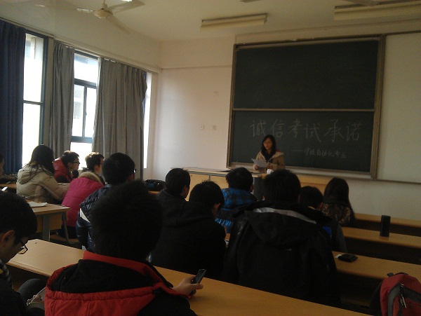 2009级自动化专业积极开展“诚信迎考”主题团日活动,团支书黄子轩同学向全体同学提出要求,每一位同学都应坚守诚信准则,严格遵守考场纪律,公平竞争。尤其是预备党员与积极分子,作为广大同学中的先进分子,更有责任和义务在生活与学习中发挥表率作用。会上,学生代表张文龙同学向大家发出倡议“端正态度,诚信考试,从严要求,从我做起”。全体同学在《诚信考试承诺书》 上郑重签下了自己的名字。