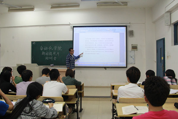 本次培训前,秘书长曹亚迪向参与此次培训会的同学阐述了撰写新闻稿的重要意义,并对在座的各位中干提出了要求和希望。随后培训活动正式开始,主讲人赵凯弟首先强调了新闻稿新鲜即时,简练真实的特点,然后对新闻稿的标题、导语、正文、结尾进行了细致、详实的介绍,仔细的讲解了各个部分的具体构成与写作要求。他还介绍了一些照片的拍摄技巧,并亲自示范怎样会抓拍到好的场景,同学们认真地听讲,不时会对不懂的地方进行提问,通过赵凯弟的点拨以及同学之间的互相讨论,同学们都感觉到受益匪浅。