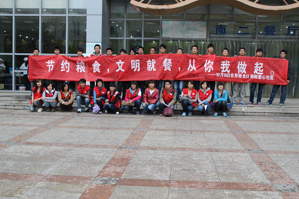 爱心社借“世界粮食日”的宣传,旨在倡导当代大学生养成节俭朴素、低碳环保的生活习惯,做勤俭节约风尚的传播者。