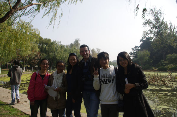 南门出发,分别前往目的地玄武湖与夫子庙,这次活动内容为找外国人进行英语交流并完成简单的英语调查。前往夫子庙的由英语角部长夏艳带领,同学们很快找到了外国人,并毫不羞涩的上前攀谈,在他们的努力下顺利地完成了交流和调查,着实锻炼了胆量与口语能力!前往玄武湖的由主席叶宇浩带领,由于玄武湖外国人很少,所以任务进行比较艰难。但是在同学们的努力搜寻下还是找到了目标,外国友人也是很热情的配合同学们完成活动。