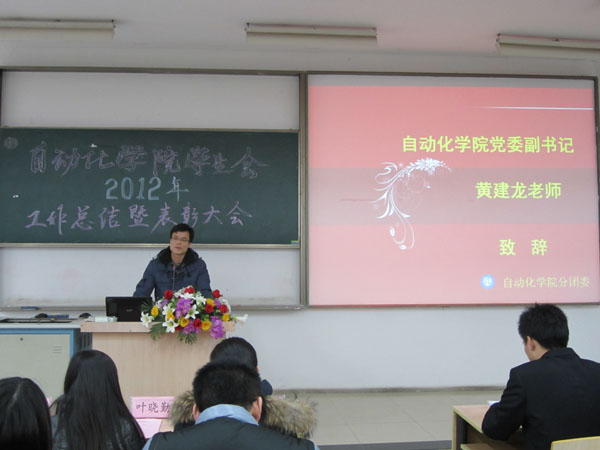 大会首先由黄建龙书记致辞。他充分肯定了学生会一年来所取得的成绩。他希望学生干部能树立学习意识,多观察多思考;明确服务理念,实现学生自我服务;加强团队合作,提高工作效率;落实自我管理,做好学生工作。他指出学生干部应当处理好三个关系:学习与实践的关系,传承与创新的关系,模范与带头的关系。随后,黄书记为自拍偷拍