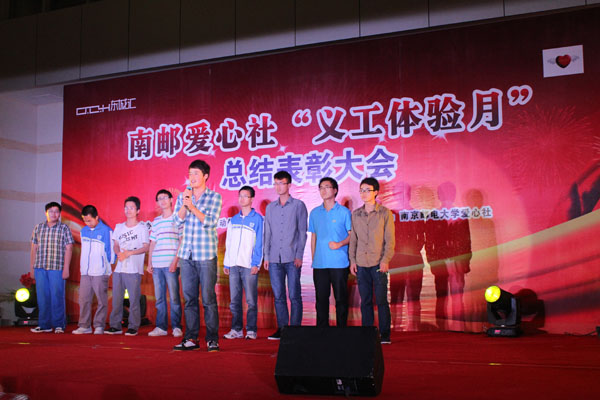 在温馨的义工活动开场视频播出之后,整19点时,热辣的爵士舞舞者登台,点燃了整个活动现场。黄建龙副书记首先上台致辞,他肯定了爱心社自成立以来所取得成绩,对爱心社为广大社外学生提供一个体验义工、奉献爱心的平台表示了赞许,同时鼓励社员们再接再厉,为将爱心社建成一个影响力更广的品牌公益社团而努力。随后,爱心社义工部部长仲星晨对本次义工体验月活动开展情况做了总结。一首诗歌朗诵《微尘》娓娓道出了参与过义工活动学生的心声,引起了在场观众的共鸣。在一首悠扬的竹笛表演之后,叶晓勤老师上台宣读了优秀义工名单,本次活动共表彰了17名优秀个人和一个优秀集体。优秀义工个人和集体代表分别上台发言,讲述了他们做义工时的体会和感悟,全场都被深深的感动了。继精彩的演出和激动人心的抽奖环节之后,总结表彰大会在爱心社温馨的手语表演节目中落下了帷幕。