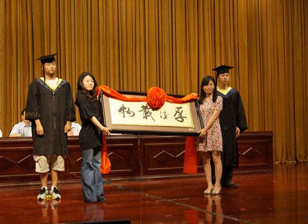 这4年的点点滴滴,他感恩学院老师的谆谆教诲与无私付出,期盼着与同学们十年二十年后的相聚。“感恩母校”道出了全体毕业生的心声,“不忘师恩”是毕业生们的承诺。随后,毕业生代表将一块写着“厚德载物”的匾额赠送给学院,寄托了全体毕业生对学院的深深眷恋和拳拳赤子之心。