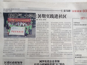 组织了大学生社区主任助理挂职锻炼服务团队走进南京市栖霞区马群街道,从7月7日到7月14日,开展了以“科技走进社区,实践感悟真知”为主题的暑期社会实践活动。团队成员们走进基层,不仅协助社区主任开展日常工作,而且开展了企业调研、科技进社区、青奥文化宣传、慰问独居老人等一系列主题活动。