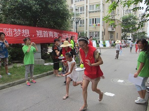 为迎接青奥会的到来,团队成员精心策划了这次主题活动。在活动现场,工作人员将图片展板放置在会场周围,并通过解说向居民介绍青奥会的历史、发展及本届青奥会的相关情况。在随后的比赛中,无论是“强强联手”托球接力赛,“投篮高手”投球赛,还是“青奥图片猜猜猜”智力赛,社区居民纷纷踊跃参加。紧张有序的比赛,表现出居民们热情参与社区活动的氛围和生活在大家庭里的快乐。三轮比赛过后,工作人员按照得分高低分别派发相应奖品。