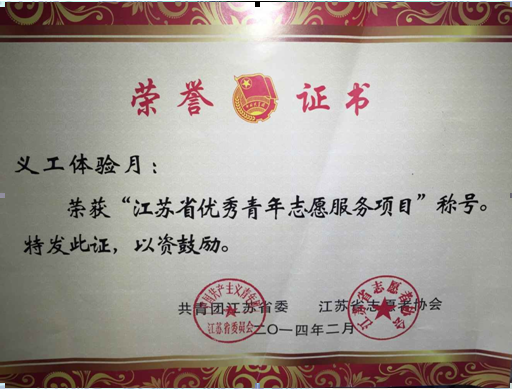 由于在志愿服务工作上的突出表现,今年上半年自拍偷拍 团委还荣获“江苏省青年志愿服务行动组织奖”,爱心社品牌活动“义工体验月”荣获“江苏省优秀青年志愿服务项目”称号。