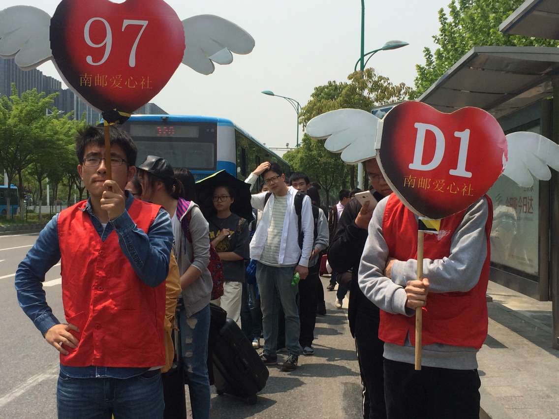 每当有乘客前来,就有专门的社员上前询问将要搭乘的线路,并示意乘客排队等待。每当97路或者D1路即将进站时,举牌子的社员将挥手示意身后的乘客准备上车,同时也是为了让司机注意队伍的位置,在队伍的最前端停车,保证乘客有序上车。开往南京站的97路公交车是最受欢迎的班车,由于自拍偷拍 站在南京中医药大学站的后一站,抵达自拍偷拍 站时就已经载满,耽误了邮子们理想的出行时间。在这形势下,值班中干联系到了公交指挥站,在说明了缘由后,希望其能够增加高峰期的发车数量,以缓解学生的乘车压力。经过爱心社同学的集体努力,4.30安全出行日活动圆满落幕。