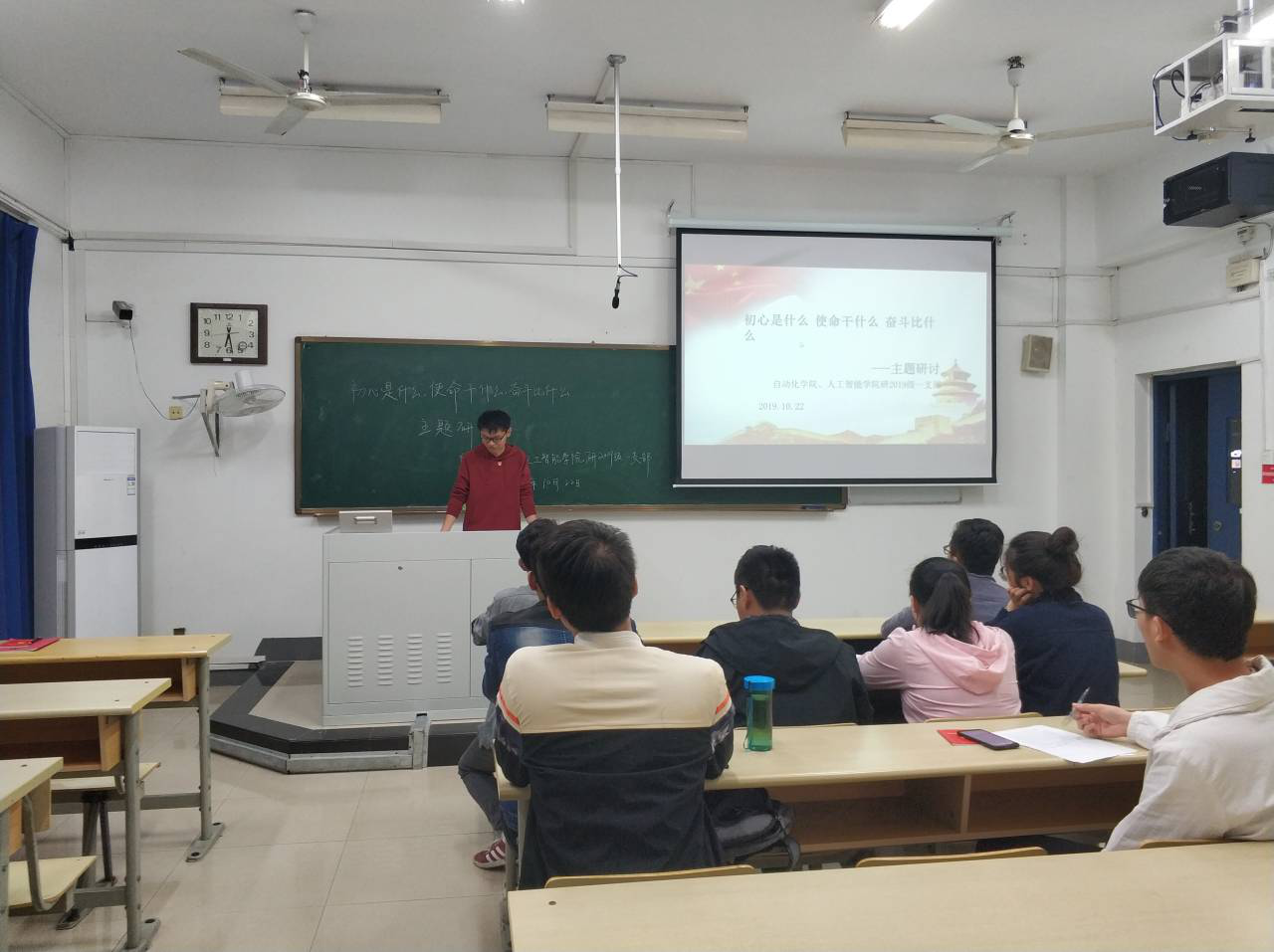 2019年10月22日晚6点半,自拍偷拍 、人工智能学院研2019级一支部党员在教4-104组织开展“初心是什么,使命干什么,奋斗比什么”的主题研讨,支部书记刘良辰主持会议、交流心得体会。