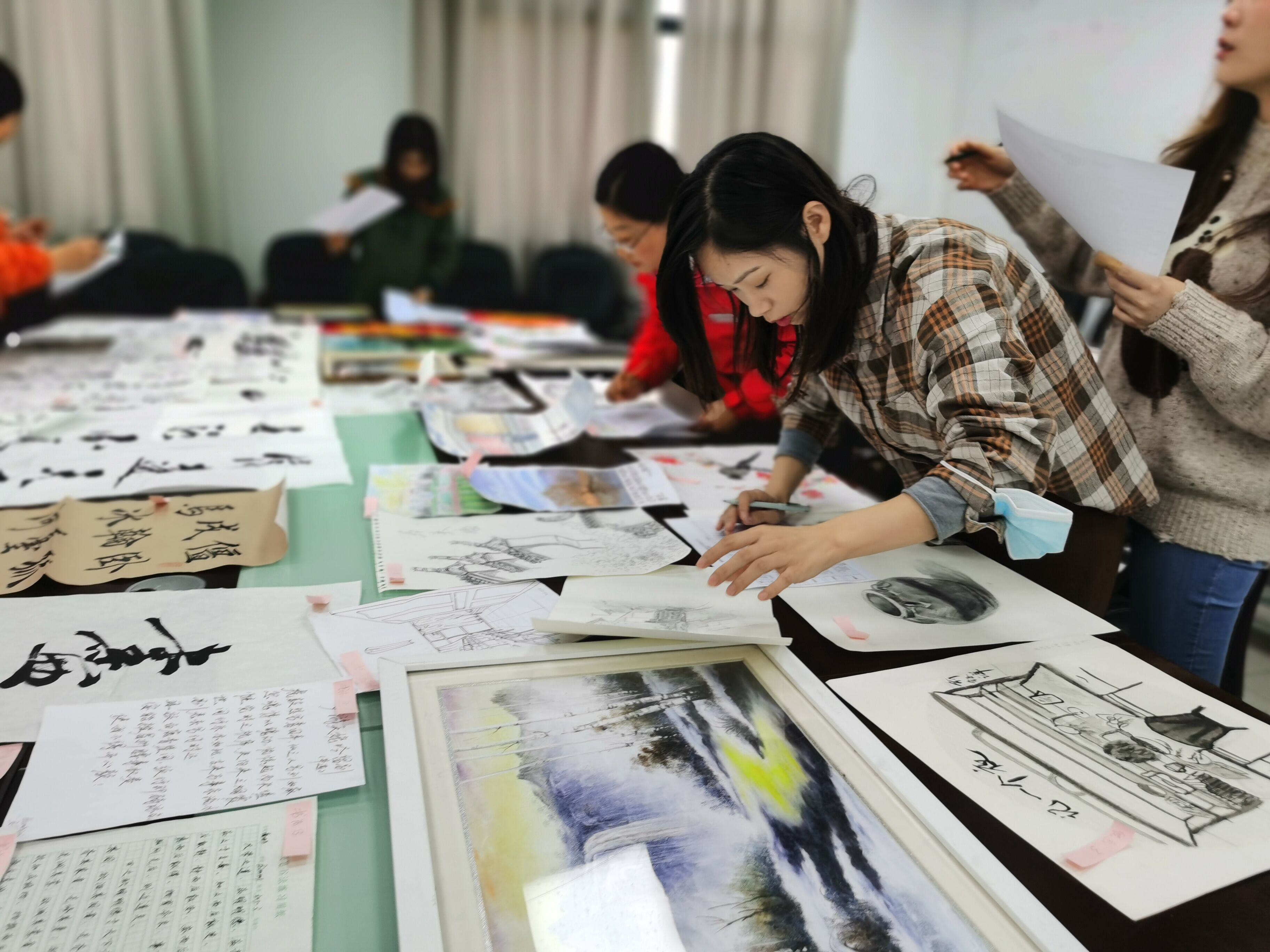 首先,吴鹏老师为参加评审会的评委介绍本届宿舍文化节提交的作品情况,让评委们对作品有了初步的了解。接着,通过屏幕浏览摄影作品的方式,各评委对大屏幕上逐一展示的作品进行打分。随后,评委们在对作品创意、艺术性、作品内容所反映出的自拍偷拍 生活气息等多方面斟酌后,分别对书法、绘画作品、剪纸、十字绣作品进行打分。