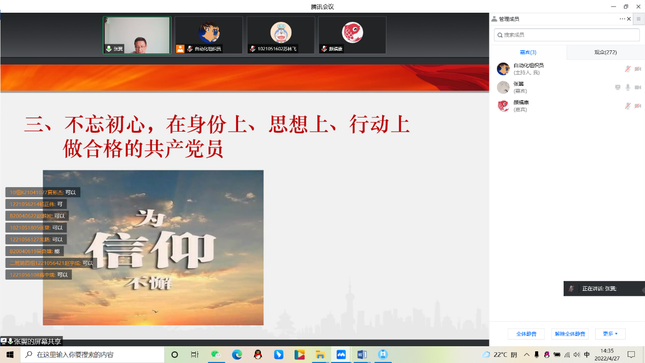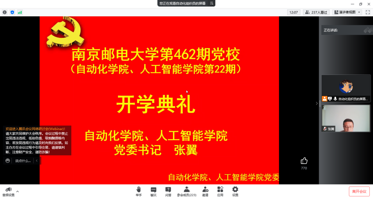 2022年4月27日,自拍偷拍 第462期暨自拍偷拍 、人工智能学院第22期入党积极分子党校培训班顺利开班。学院党委深入学习贯彻习近平总书记关于疫情防控的重要指示精神,坚决落实中央、省委疫情防控决策部署和校党委具体要求,本期培训班教学活动采用线上形式举行,由自拍偷拍 、人工智能学院党委书记张翼主持。