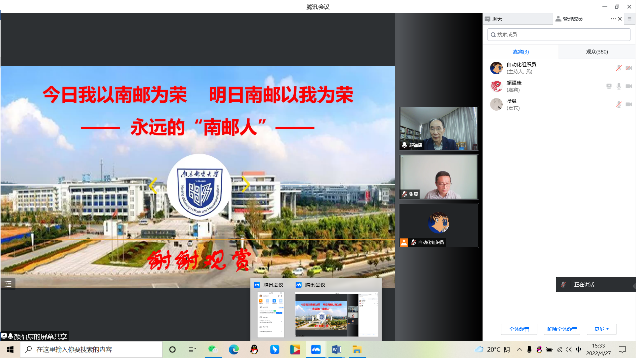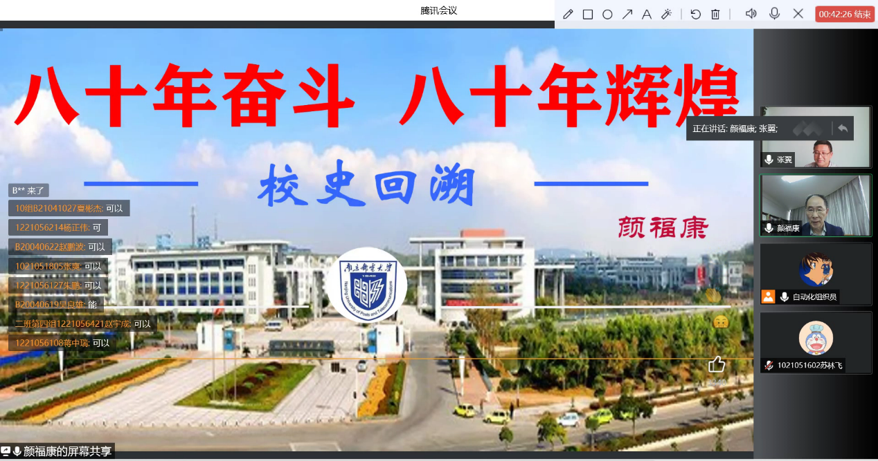 4月27日,自拍偷拍 、人工智能学院入党积极分子聆听了由校关工委颜福康老师带来的“八十年奋斗、八十年辉煌”红色校史主题讲座。根据学校疫情防控要求,本次讲座全程采用线上形式开展。
