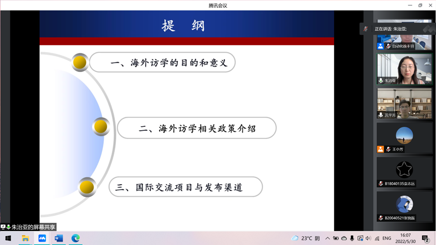 为推进学院国际化人才培养工作,增强学生对暑期国际交流项目的了解。5月30日下午,学院邀请国合处朱治亚老师和上海罗客实业集团沈华光老师,以线上直播的方式开展海外访学政策及项目的宣讲活动。宣讲会由副院长徐丰羽主持,2020级和2021级辅导员及部分学生参会。