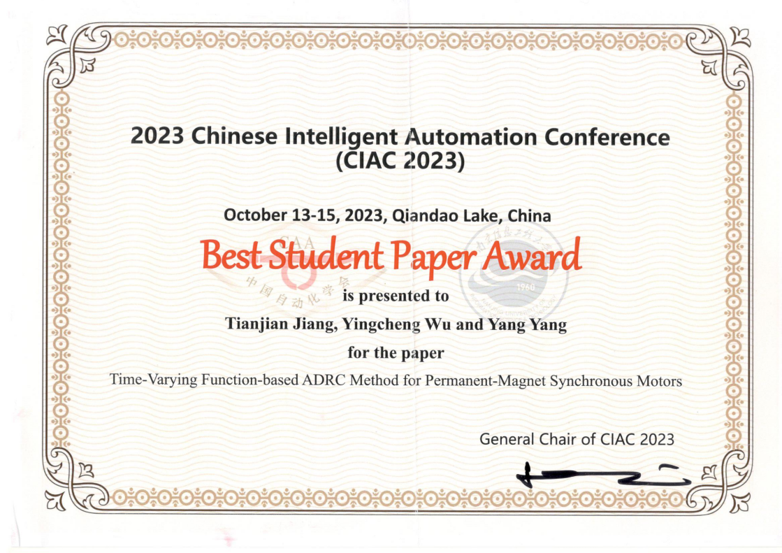 自拍偷拍 杨杨教授指导的智能科学与技术专业2020级本科生蒋天健论文《Time-Varying Function-Based ADRC Controller for Permanent-Magnet Synchronous Motors》经大会评审,被评选为会议唯一的最佳学生论文奖(Best Student Paper Award)。