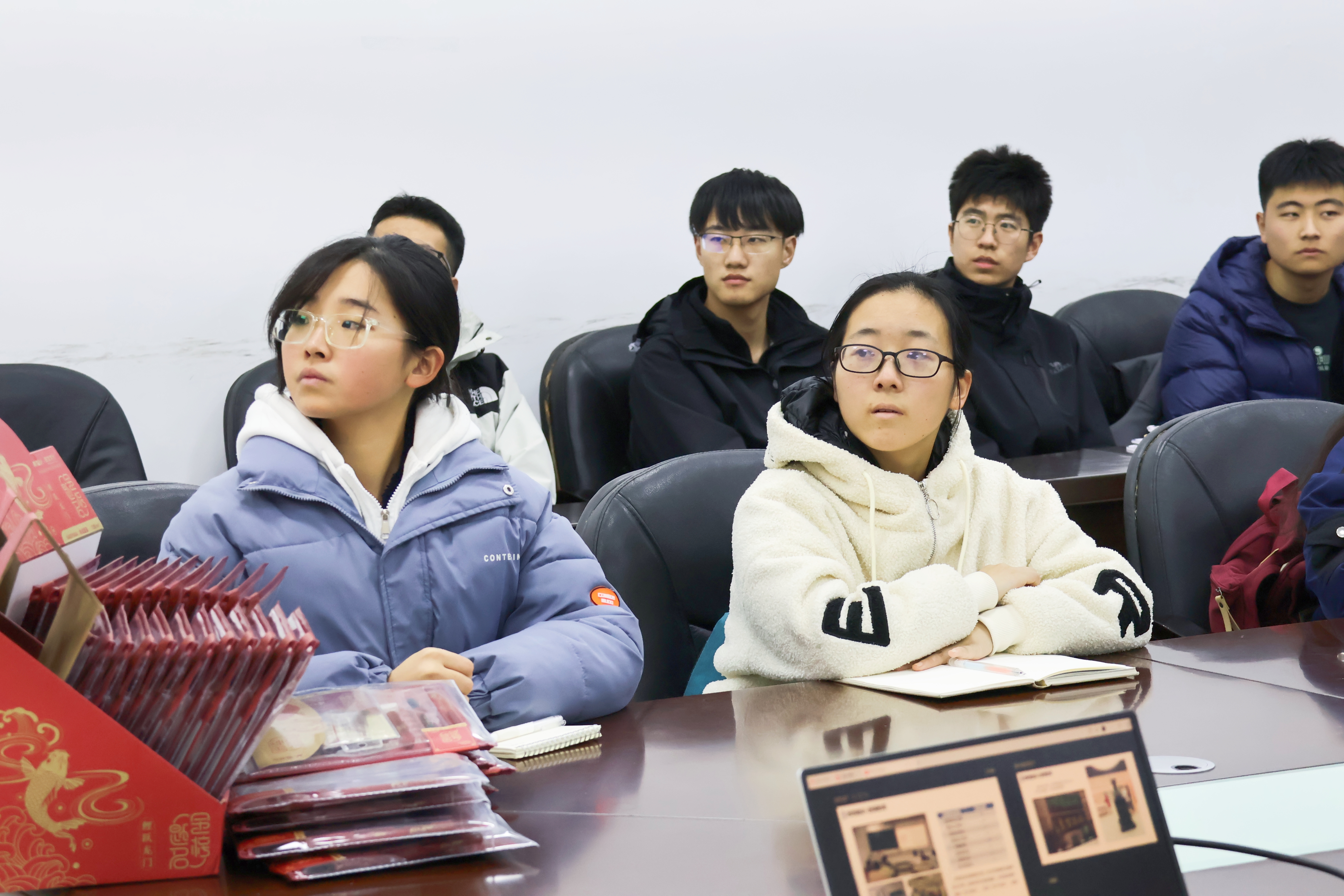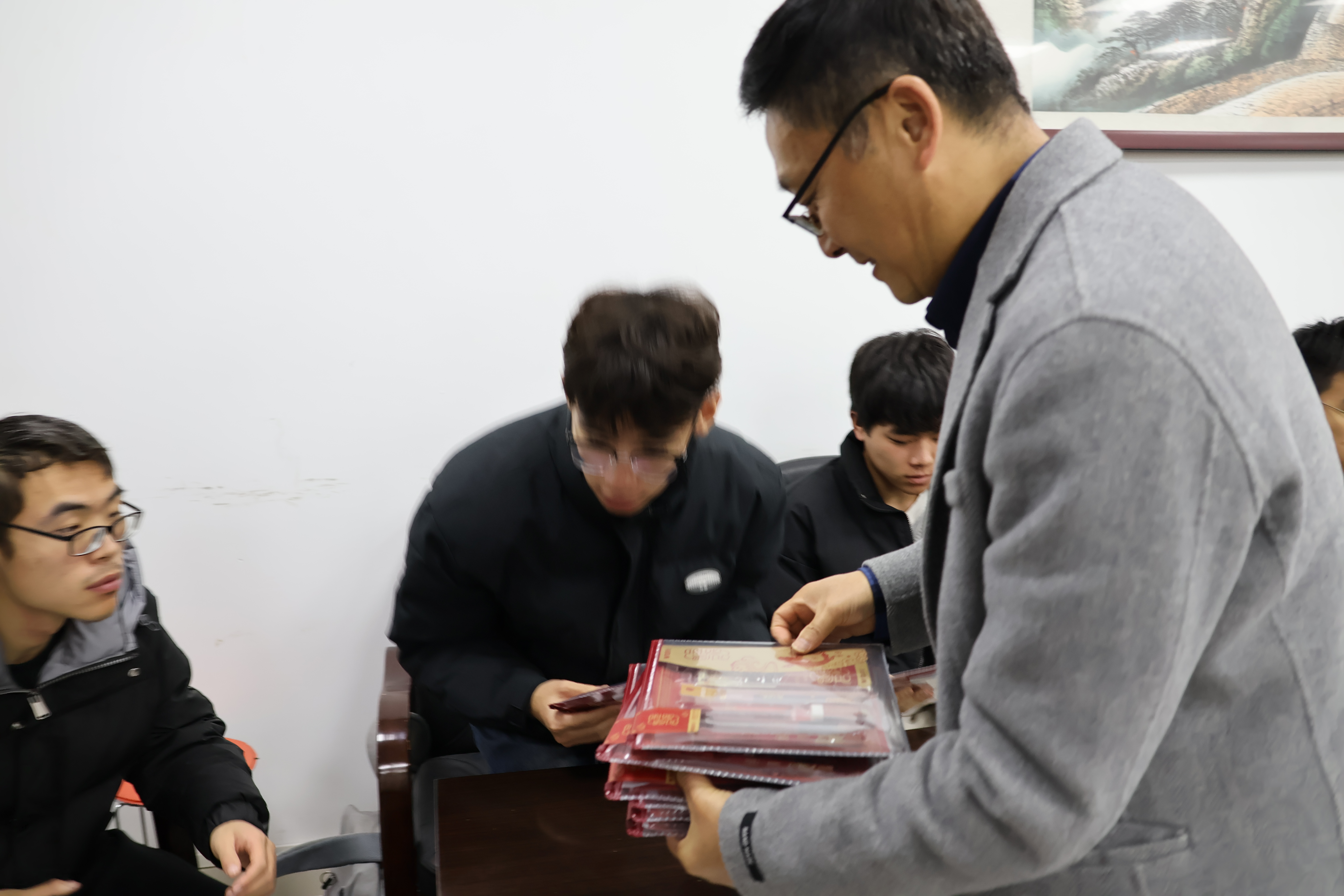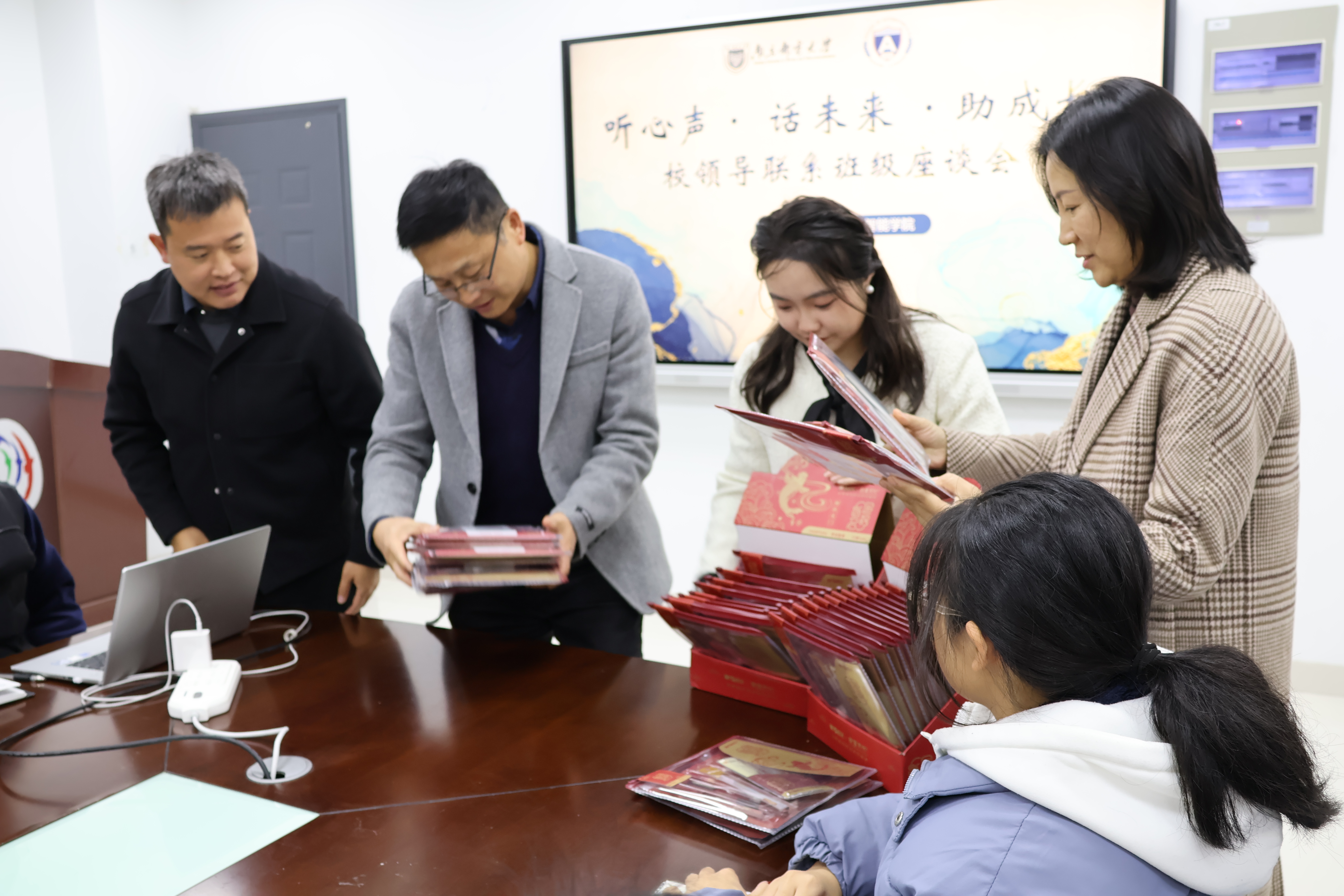十二月是期末季、考试季。辅导员齐沁儿老师为同学们准备了故宫文化主题文具套装,希望用红火精美的包装、丰富实用的配置和细节满满的心意,为大家的复习备考助力。张敏部长、张翼书记、孙委委副书记向每一位在场同学亲手送上小礼物。