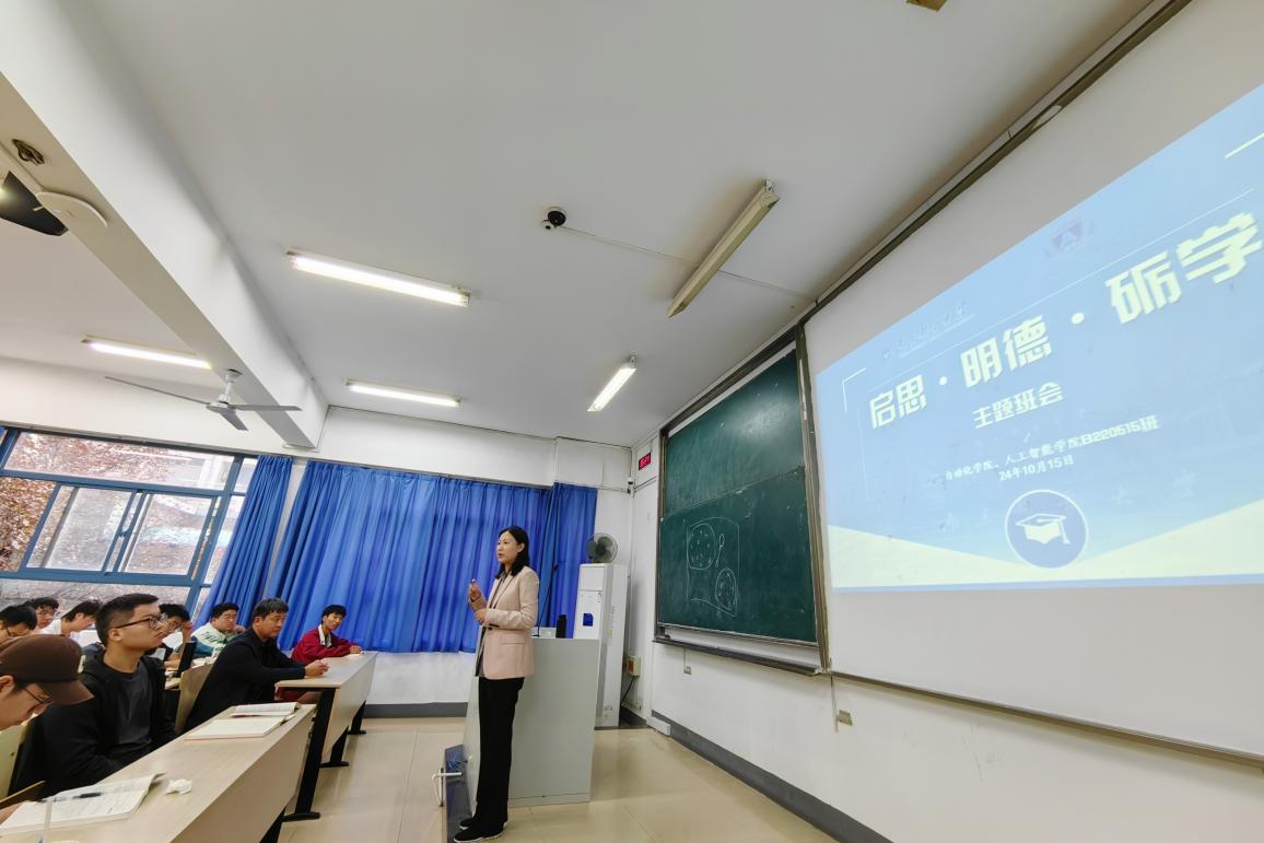 为落实立德树人根本任务,深化三全育人格局,畅通学校与学生的沟通渠道,落实“三进三谈三联”工作制度,做好“进百班、入千室、访万生”大走访活动,营造良好学风,迎接本科教育教学审核性评估,10月15日下午,校党委常委、宣传部部长张敏走进自拍偷拍 、人工智能学院B220515班,和学院党委副书记孙委委、带班辅导员齐沁儿一起,深入课堂和班级,了解同学们常态化的学习状况,并为同学们开设了一场别开生面的“启思·明德·砺学”主题教育微班会。