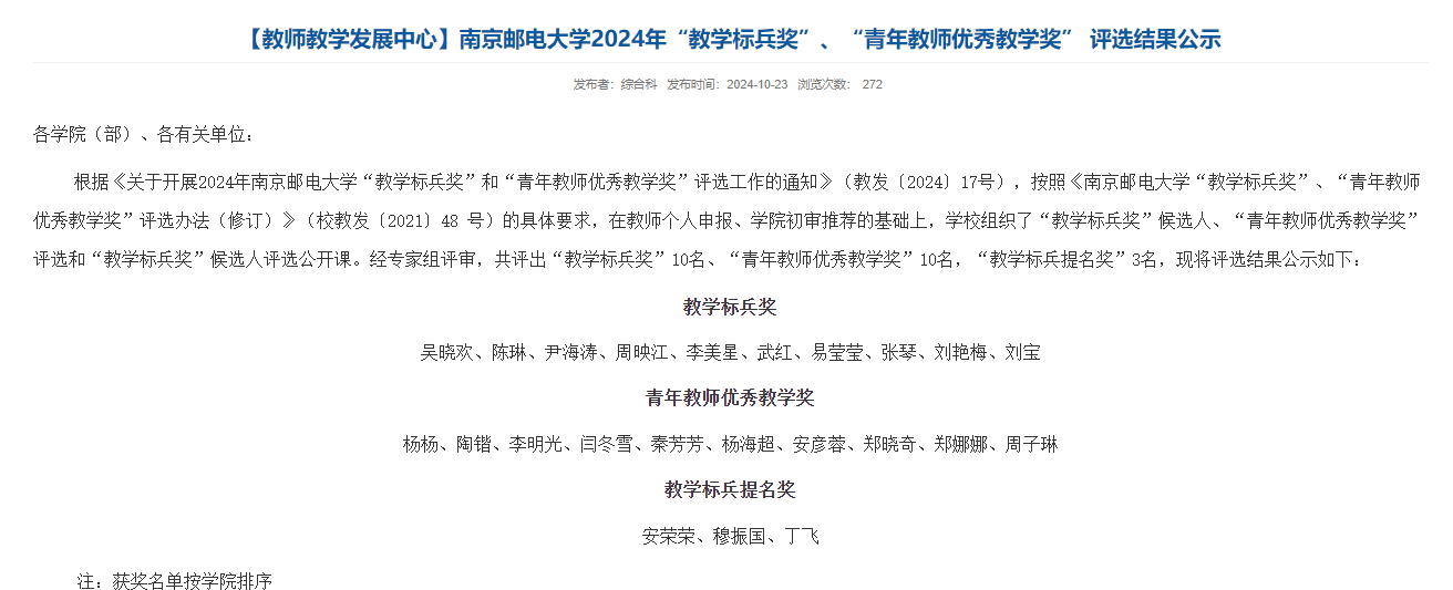 近日,教务处(教师发展中心)公布了2024年“教学标兵奖”、“青年教师优秀教学奖” 评选结果,自拍偷拍