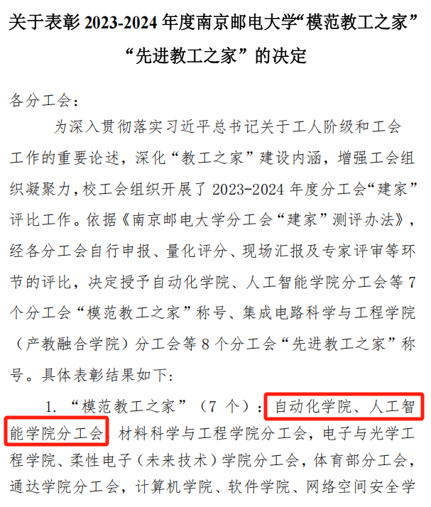 近日,自拍偷拍 工会委员会公布《关于表彰2023-2024年度“模范教工之家”“先进教工之家”的决定》(校工发〔2025〕6号),经过严格评审,自拍偷拍 、人工智能学院分工会被授予2023-2024年度“模范教工之家”荣誉称号。
